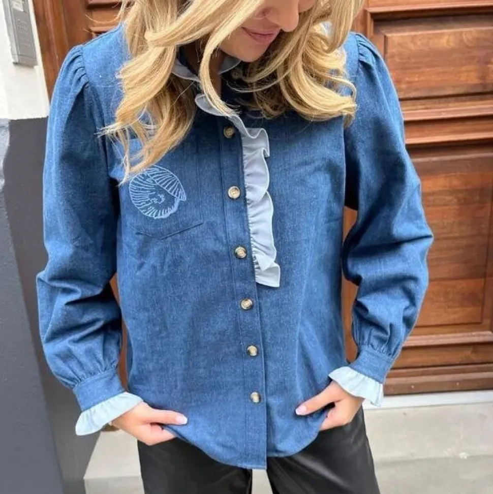 Raffineret denimskjorte med feminine detaljer. Flæsedetaljerne i kontrastfarvet stof skaber et delikat spil i designet, mens det broderede muslingemotiv på brystlommen tilfører et unikt, karakterfuldt element. Den skjulte elastik ved håndleddet giver en blød, behagelig pasform og et let, flydende fald. Et alsidigt garderobeitem, der fungerer til både hverdagsbrug og mere polerede outfits, og som tilfører subtil elegance og personlighed til ethvert look.