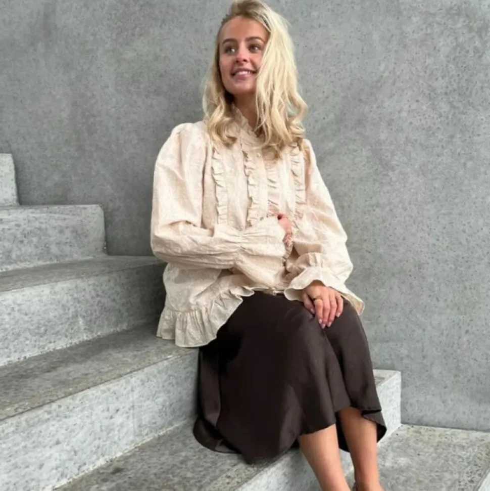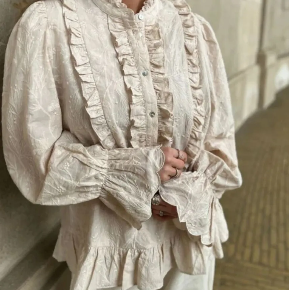 Denne beige bluse forener tidløs elegance med feminine detaljer. Den høje hals og de fine flæser langs knaplukningen giver et stilrent og sofistikeret look. Ærmerne har let puffet volumen og afsluttes med manchetter med flæsekant, som fremhæver det romantiske design.
