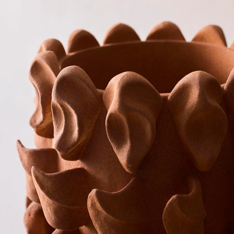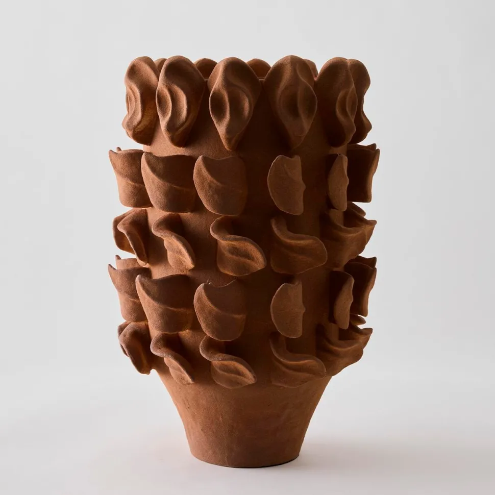 Skulpturelt kunsthåndværk i porcelænsler, der forener tradition og tidløs elegance. Vasen støbes først i en form, hvorefter hver eneste detalje påføres omhyggeligt i hånden, hvilket skaber en unik karakter i hver eneste kurve. Den matte glasur fremhæver den organiske form og tilføjer et diskret, sofistikeret udtryk.