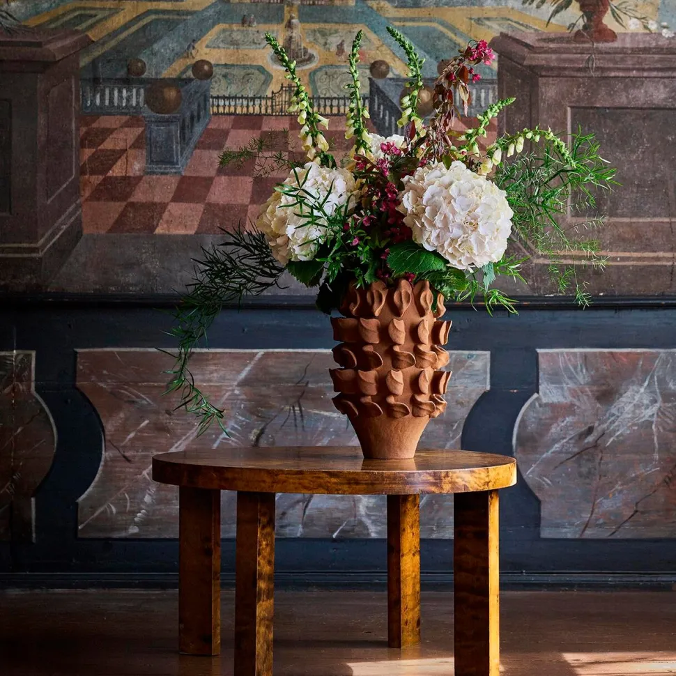 Indersiden er behandlet, så vasen kan rumme vand og fungere til friske blomster, men den naturlige porøsitet i leret betyder, at der kan forekomme let fugtpassage – som følge heraf anbefales det at placere den på en beskyttet overflade.