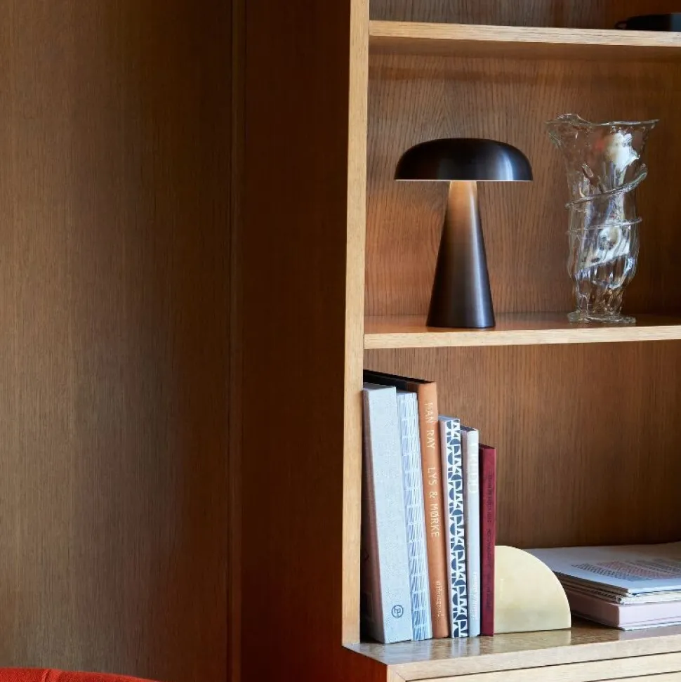 Match belysning og stemning med Como, en bærbar bordlampe designet af Space Copenhagen. Fremstillet af anodiseret aluminium, spidser Comos robuste base op mod en blødt buet, svampeformet skygge. Como kan fås i seks forskellige udgaver: Black, Brass, Bronzed, Red Brown, Stone Blue og Aluminium.