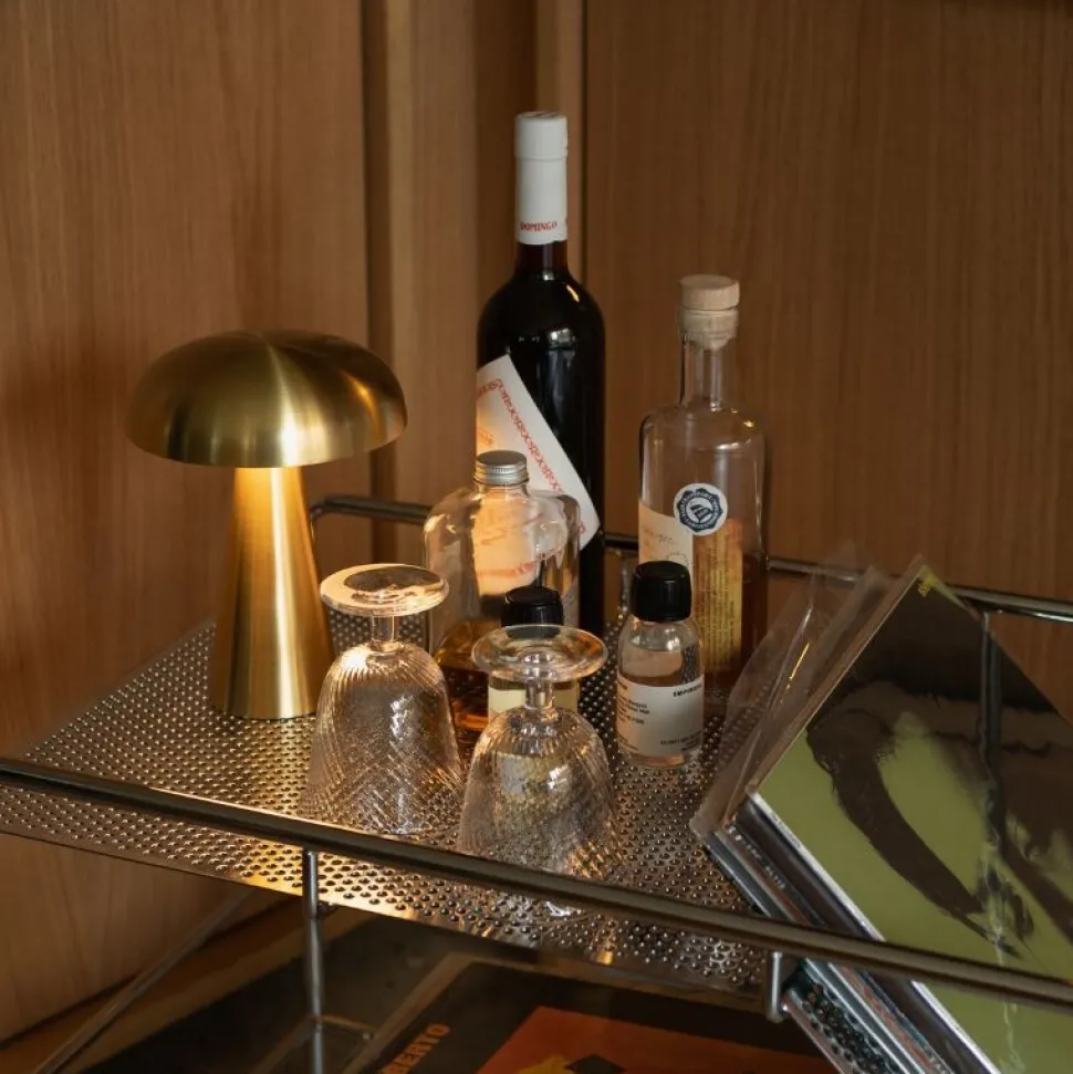 Match belysning og stemning med Como, en bærbar bordlampe designet af Space Copenhagen. Fremstillet af anodiseret aluminium, spidser Comos robuste base op mod en blødt buet, svampeformet skygge. Como kan fås i seks forskellige udgaver: Black, Brass, Bronzed, Red Brown, Stone Blue og Aluminium.