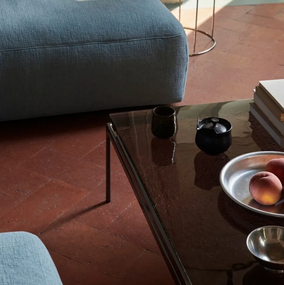 Bordplade: Røgfarvet støbt glas.
