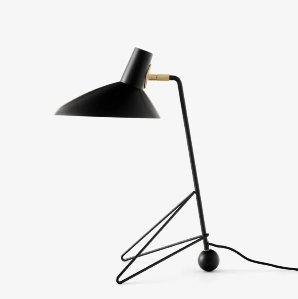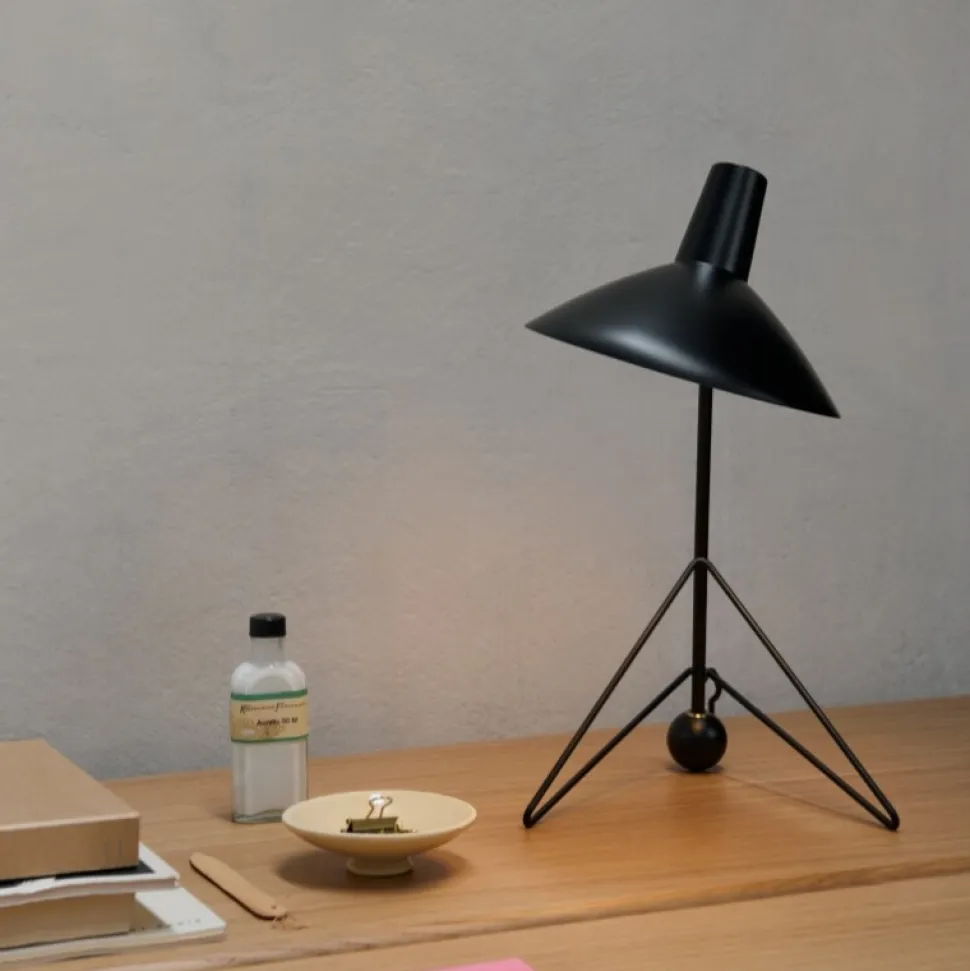 Tripod, en bordlampe bygget af pulverlakeret stål med messingdetaljer, afspejler den rene minimalisme fra den københavnerbaserede duo Hvidt & Mølgaard. Betragtet som gamle mestre i dansk design fra midten af århundredet, giver deres værker ofte et skulpturelt element til de rum, de bor i. Tripod kommer med en drejefunktion i skærmen, som giver lampen en fremragende alsidighed.