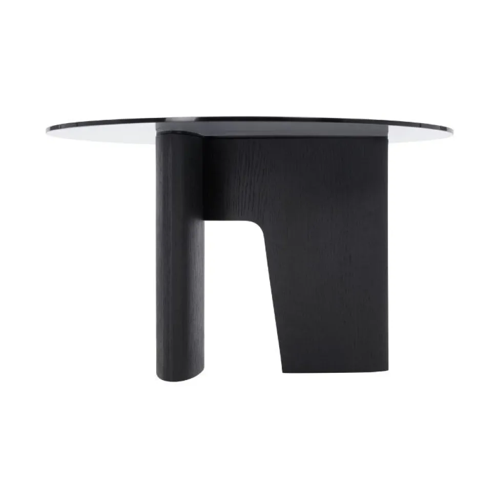 Stilren og moderne sidebord. Fås som sidebord og som ovalt sofabord. En skulpturel silhuet definerer Glyph-serien, designet af det tyske designstudie, Hoffmann Kahleyss Design. Den let gennemskinnelige bordplade i sorttonet hærdet glas svæver over den sortbejdsede egetræsbase, i meget gennemført stil, som resulterer i et smukt og enestående sidebord.