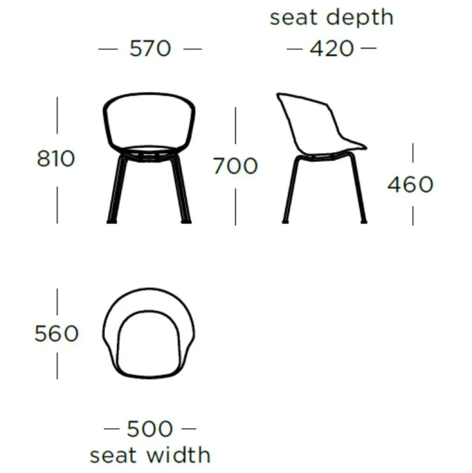 Elegant og behagelig spisebordsstol. Stålstellet på V2 tilføjer lethed til det rummelige design af skallen. En let hældning foran og bagpå skallen giver en behagelig siddekomfort. Med sin bløde form omfavner armlænene elegant ethvert bord, hvilket gør stolen perfekt til alle slags omgivelser.